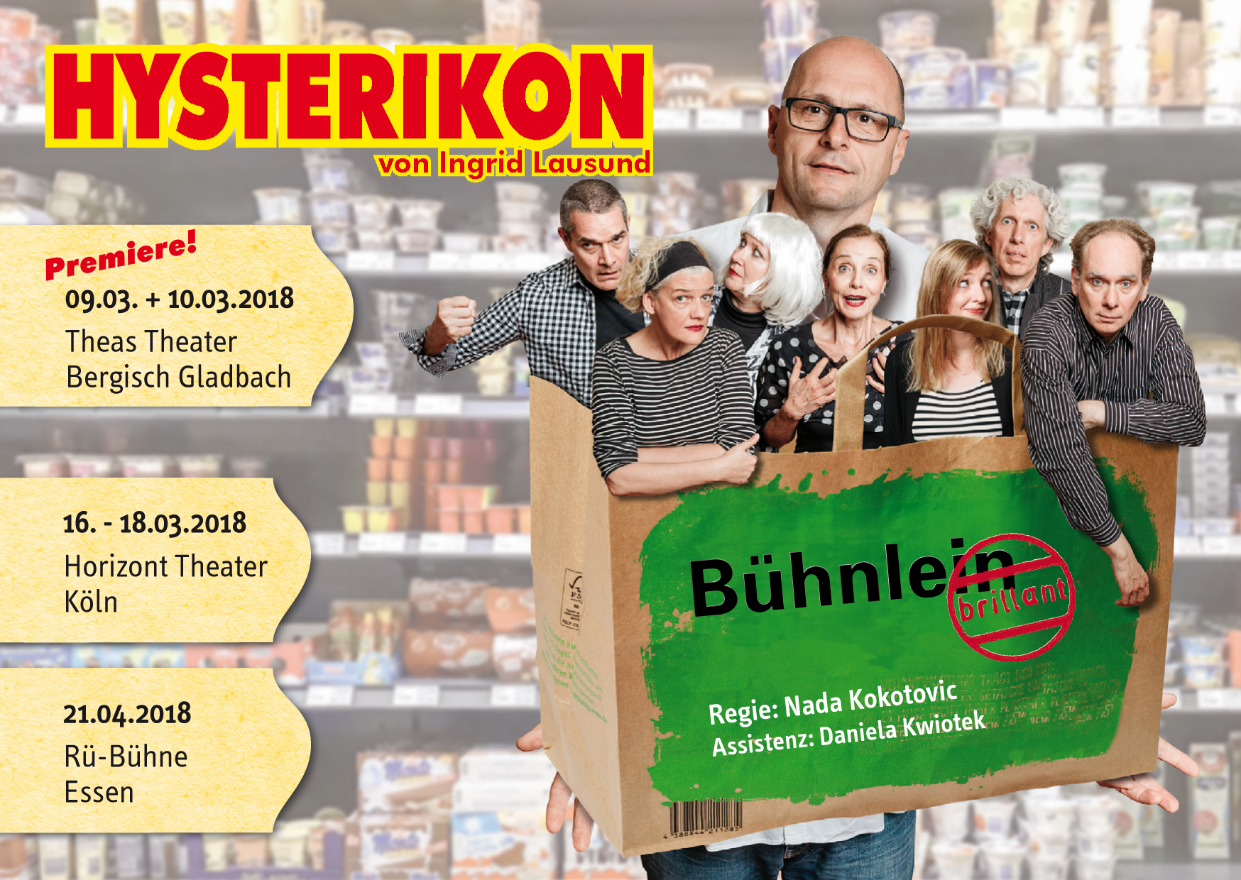 Spielen werden wir Hysterikon von Ingrid Lausund. Die ehemalige Hausautorin und Regisseurin des Deutschen Schauspielhaus Hamburg ist u. a. auch die Autorin der TV-Serie „Tatortreiniger“. Feine, scharfe Dialoge, skurriler Humor – ganz unsere Linie.